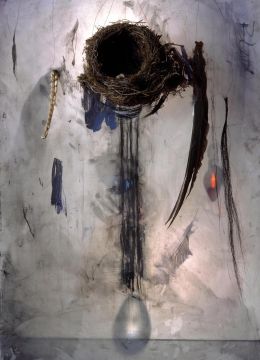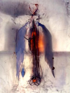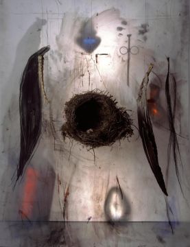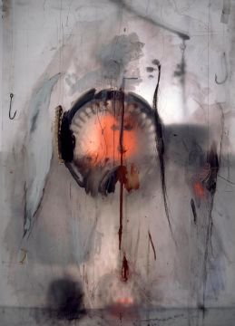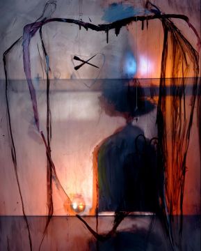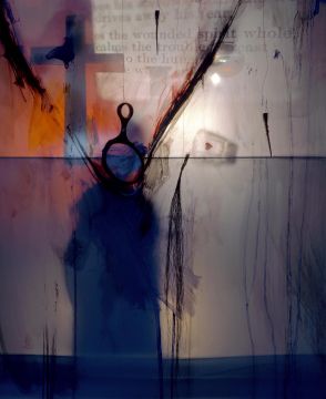 In these new works, the use of transparency, translucency and shadow is apparent. Objects are positioned both in front of and behind a diffusing screen. Light is used to both sharpen and diffuse the focus on certain objects, and this is contrasted with drawing, applied colour, drips of paint and dense networks of graphically incised markings. The adoption of theatrical modes of lighting seen here marks a departure from the descriptive clarity and opacity of her earlier photographic prints.