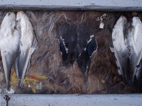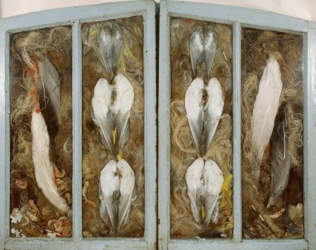 The panels on the surrounding wall contained many rows of bird’s wings of one species or another surrounded and held in by hair. The panels were from a disused cutlery factory, all pale blue, which contrasted with the black, fading to white, of the human hair. The wings bring with them associations of flight, freedom and this spiritual potentiality contrasts strongly with their now earthbound and entombed state. Hair and associated references to it’s cutting is often used in Holland’s work. Scissors, blades, knives etc. sit along side fishhooks, floats, lead weights and feathers. Cut hair has no value, it’s almost repulsive, but historically great importance has been attached to its collection or destruction. Hair is a unique quantifier or measure of time and in the work it becomes a symbol of control and in it’s cutting, of liberation.
