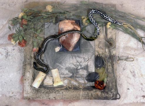 ‘Her show comes across with the arresting force of some un-heard of obsession or embarrassingly weird perversion. Dead reptiles, dried and faded flowers, a glass eye, old board games, scraps of old books and letters are arranged and photographed to form an enchanting late 20th century revival of memento mori still-life’
