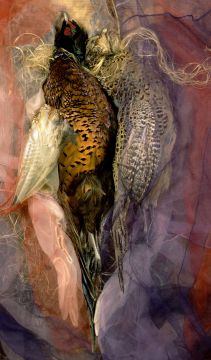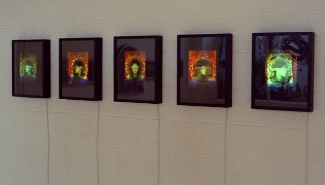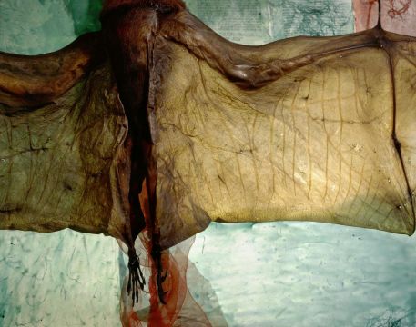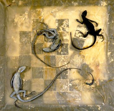 The installation in gallery four ‘The Three Cornered House’ was an amalgamation of these techniques. In the centre of the room hung the three large transparent photographic panels, each indicative of earths division into land, sea, and air, the inhabitants, cross over points and movement between these layers. Flying fish, snakes, frogs, birds and lizards inhabit the images. Part of the fascination with birds and fish has always been their ‘other world’ quality. Holland says, ‘I used to go fishing when I was a teenager; it was the thrill of catching something from this other world, so foreign and exotic and being able to view that which is usually unseen. Creatures that moved between these two worlds held even more interest, especially those which underwent some kind of metamorphosis.’