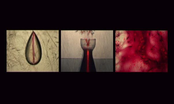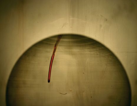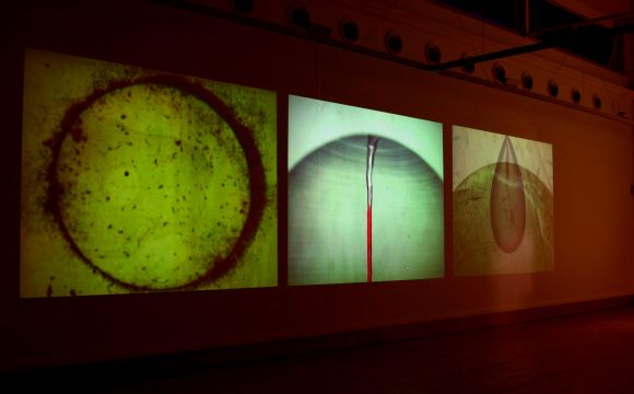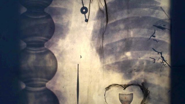 Transformation through descent into the depths is a ubiquitous myth; from the story of Inanna, through to Osiris, Persephone, Attis, Mithra and Jesus, it embodies a symbolic metamorphosis and talks of the cycle of descent and return, or resurrection. Akin to other resurrection stories, this is an allegorical journey of the soul and an expression of the continuity of life. This is contrasted in the work with images associated with the scientific ‘fact’. There are references to the study of haematology and associated tools; glass slides, circular globes full of liquid for magnification and distortion. Lightning and blood are assigned the same properties of magic and renewal. Still images are layered with moving footage; X-Ray, magnetic and histological medical imaging images are used to contrast veins and arteries on the heart to the appearance of tree branches and reed roots in soil.