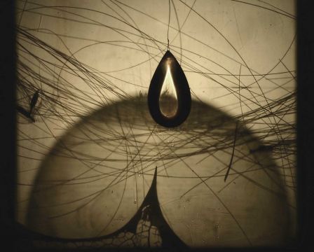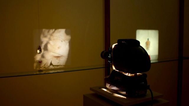 This series of 5 back-projected still images created by a combination of projected slides (assemblages of photographic images and natural objects sandwiched between glass) with actual still life objects intervening between the projector and screen. The resulting image is a mix of real object, sharply defined silhouette and projected image. When someone walks past, the free hanging objects (such as the small glass vessels containing liquid) which are silhouetted against the drafting film screen shift slightly. The effect of this is to make people look behind the screen in order to determine how the image is created. It emphasises the transient nature of these constructed images.