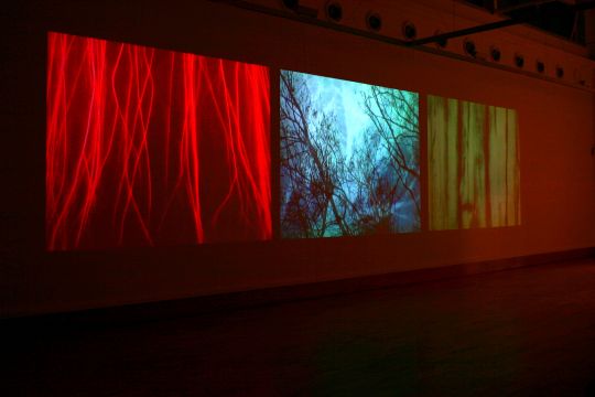 This work was presented here as a moving triptych of images with story lines united upon occasion across all 3 screens or else following complimentary threads. Each screen possesses it’s own soundtrack, and the sound, along with the size of the images projected onto the wall, each measuring 10 foot in width, meant that the work was an immersive experience, encompassing the viewer.
