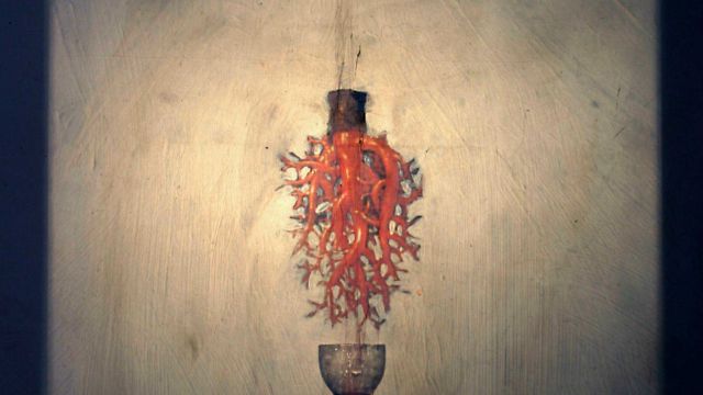 These slide images show details from devotional paintings: such as a network of pink coral, symbolic of the blood of Christ but which has the feel of a network of arteries full of blood, the reddened eye and tear of a sorrowful Jesus, and Christ’s torso with side wound. The wound, like the other details and portrayed in so many paintings, is a focus of devotion, the gateway to His loving heart. In contrast to these are the magnetic resonance and X-ray images of rib cages and of main arteries and veins around the heart. The latter have a shadowy ambiguous appearance. The knarled and contorted branches all interconnecting in plant-like form, and the rib cage appears like a vaulted ceiling and wall which houses and protects all this along with the precious heart.